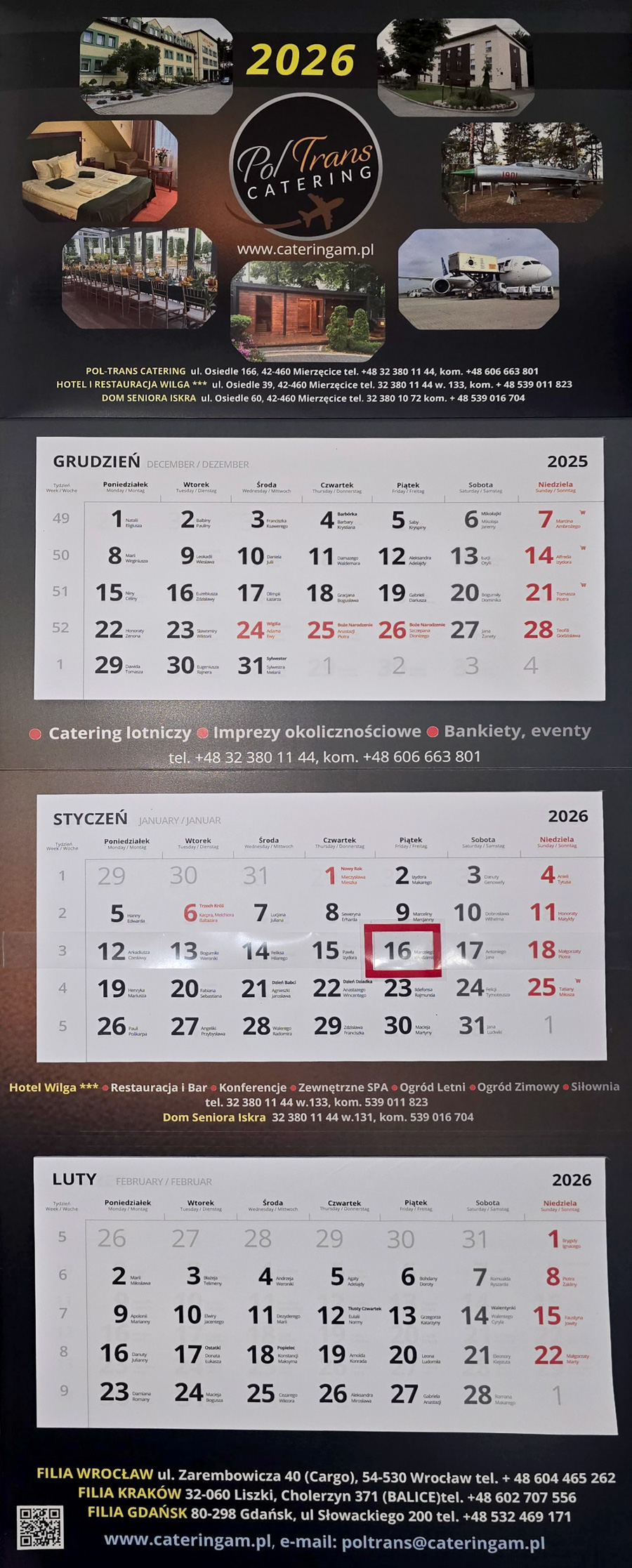 W naszej firmie zamówisz solidne kalendarze jednodzielne, trójdzielne, spiralowane lub listwowane!